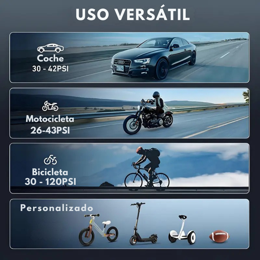 ¡Infla neumáticos con practicidad y potencia donde estés! Ideal para coches, motos, bicicletas e incluso balones.