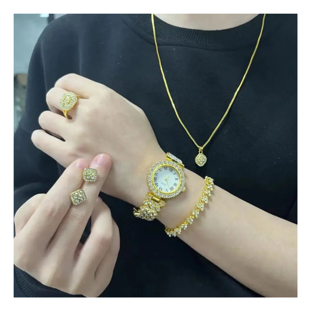 Este kit premium incluye un smartwatch A58 Plus, un reloj clásico fashion, joyas doradas exclusivas y una pulsera adicional — todo cuidadosamente presentado en una caja elegante, perfecto para uso personal o como regalo especial.
