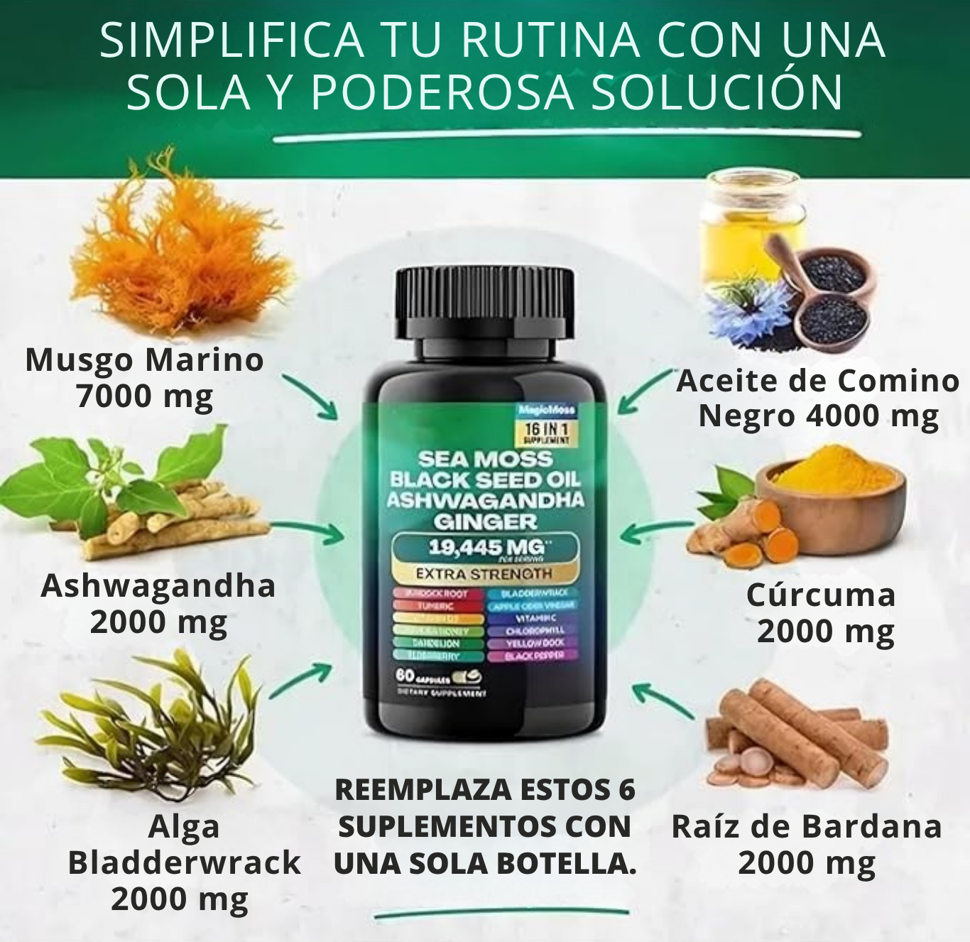 Suplemento Natural 8 en 1 – Sea Moss – Black Seed Oil – Ashwagandha – Extra Strength 19,445 mg | 120 cápsulas